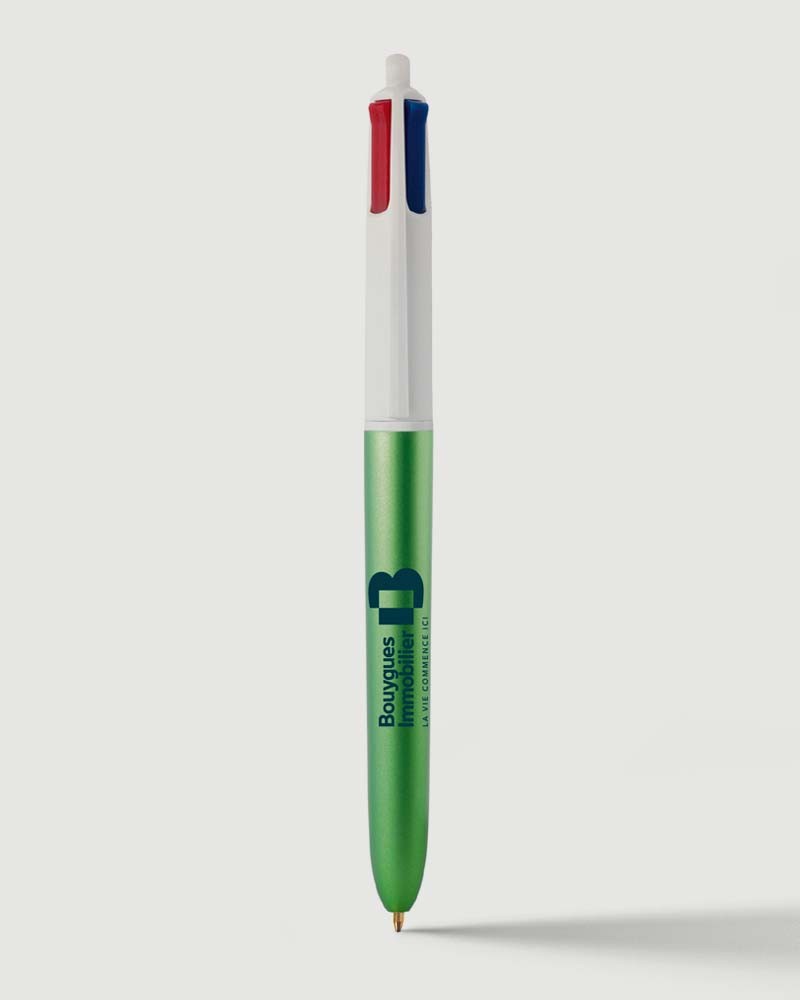 Le célèbre BIC® 4 couleurs BOUYGUES IMMOBILIER est fabriqué en France : icône de la marque, il est présenté dans une couleur VERT GLACE.